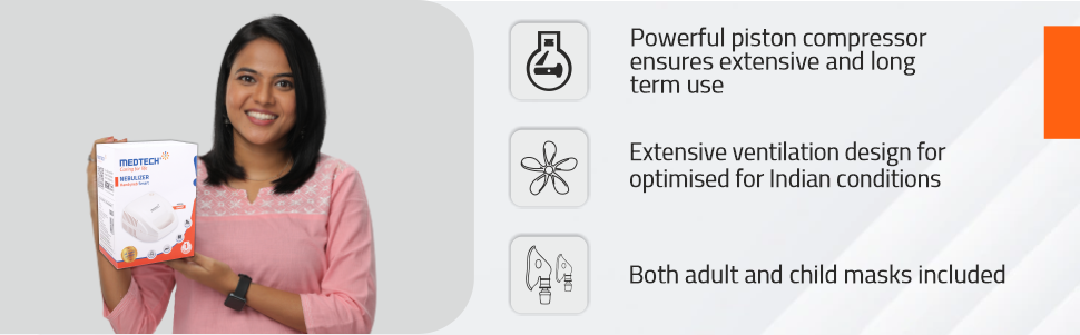 The Medtech Nebulizer has a powerful piston compressor that is meant for long time use and lasts long. The nebuliser is designed specifically to last long in Indian weather conditions.