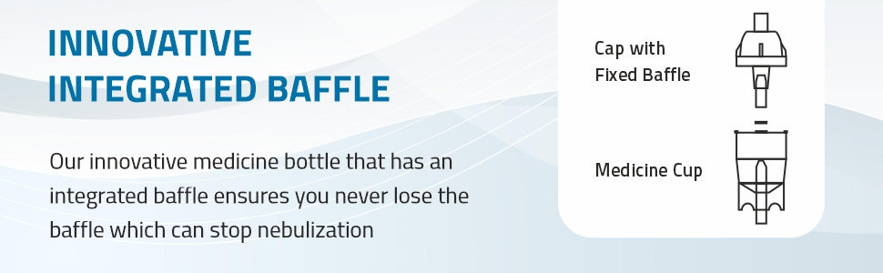 We at Medtech wanted to make nebulization hassle free and hence we innovated with the baffle in the medicine cup. While other brands offer a loose baffle which is a tiny part in the medicine cup and can get lost which completely stops the nebulization, We came up with an innovative integrated baffle design ensures that you never lose any parts of the nebulization cup, thus letting you have a hassle-free usage of the product.