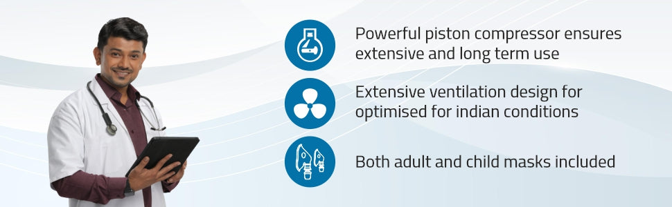 The Medtech Nebulizer has a powerful piston compressor that is meant for long time use and lasts long. The nebuliser is designed specifically to last long in Indian weather conditions.
