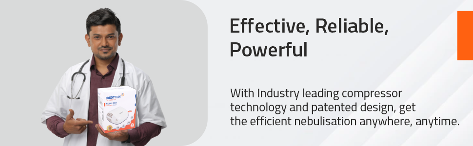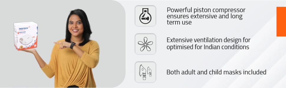 The Medtech Nebulizer has a powerful piston compressor that is meant for long time use and lasts long. The nebuliser is designed specifically to last long in Indian weather conditions.