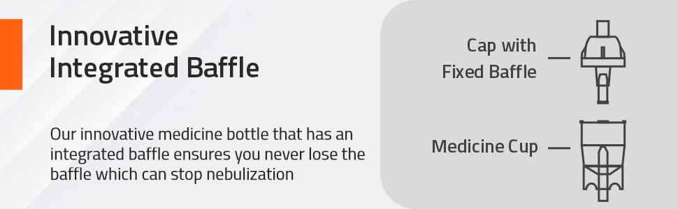 We at Medtech wanted to make nebulization hassle free and hence we innovated with the baffle in the medicine cup. While other brands offer a loose baffle which is a tiny part in the medicine cup and can get lost which completely stops the nebulization, We came up with an innovative integrated baffle design ensures that you never lose any parts of the nebulization cup, thus letting you have a hassle-free usage of the product.